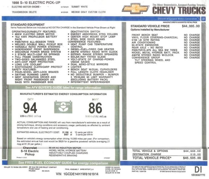 1998 S10E Dealer Window Sticker